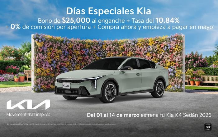 Vive la experiencia de conducir un Kia K4 Sedán 2026 con los Días Especiales Kia. Aprovecha un bono de $25,000 directo a tu enganche, una tasa preferente del 10.84% y 0% comisión por apertura. Además, compra ahora y difiere tu primer pago hasta mayo. Diseño sofisticado, tecnología avanzada y seguridad líder en su clase.
